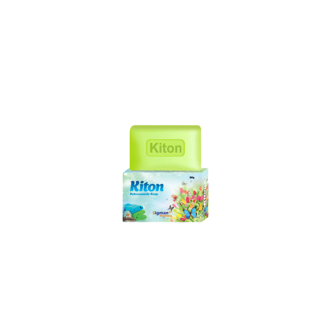 Kiton Soap is a medicated antifungal soap formulated to treat various fungal and yeast infections of the skin and scalp. It contains two active ingredients: Ketoconazole (2% w/w) and Zinc Pyrithione (1% w/w). Ketoconazole disrupts the fungal cell membrane, effectively killing the fungus, while Zinc Pyrithione helps control fungal growth and reduces irritation, redness, and flaking.